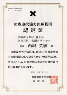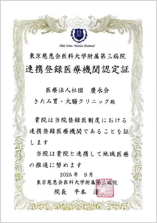 ※当院は、慶應義塾大学病院医療連携協力医療機関、東京慈恵会医科大学附属 第三病院登録医、関東中央病院登録医に認定されています。
